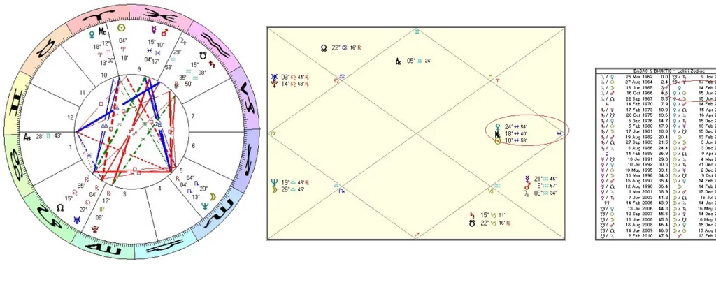 (1) There’s more to learn about the various diagrammatical format and tabulation conventions of Jyotish, but it’s not essential for us to go into it here now. These basic adjustments of the ‘calculation settings’; the application of a Sidereal Zodiac and Whole Houses, will give the correct Jyotish sign and house placements. Bear in mind when converting charts in this way that if the Ascending degree of a Sidereal chart is close to the cusp of two signs, a small error in the time of birth could result in a dramatic change in the house placements of all the planets.