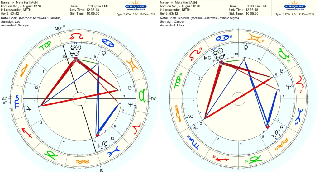 Mata Hari’s chart contains Shasha Yoga (according to Light on Life’s broader definition of the formation of Mahapurusha Yogas, which includes the 5th and 9th Houses, over and above the Kendras), since Saturn is in Aquarius in the 5th House. This yoga recurs from her ‘Chandra Lagna’, or ‘Moon Ascendant’- a principle which will be expanded on below.