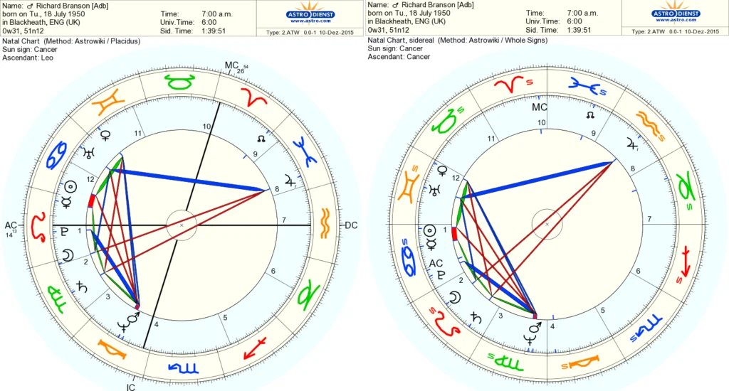 In Richard Branson’s chart Moon is lord of the 1st House (a Kendra) in mutual aspect (due to being in opposite signs) to 9th lord Jupiter. So this is a Raja Yoga of a kind in his 2nd and 8th Houses. It could be added that Jupiter as 9th lord being in mutual aspect to 7th lord Saturn forms another Raja Yoga combination in the same 2nd/8th axis.