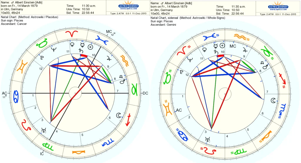 Neecha’ means debilitation and ‘Bhanga’ the breaking thereof. This breaking or cancelling of the debilitated status of a planet can occur in a number of ways. For one, the stronger the debilitated planet’s dispositor is, the better. If a debilitated planet’s dispositor is in an angular house, this cancels the debilitation. In Einstein’s case Mercury’s debilitation is cancelled by the fact that Venus, the planet that would be exalted in Mercury’s debilitation sign (Pisces), is in fact so powerfully placed in his chart.