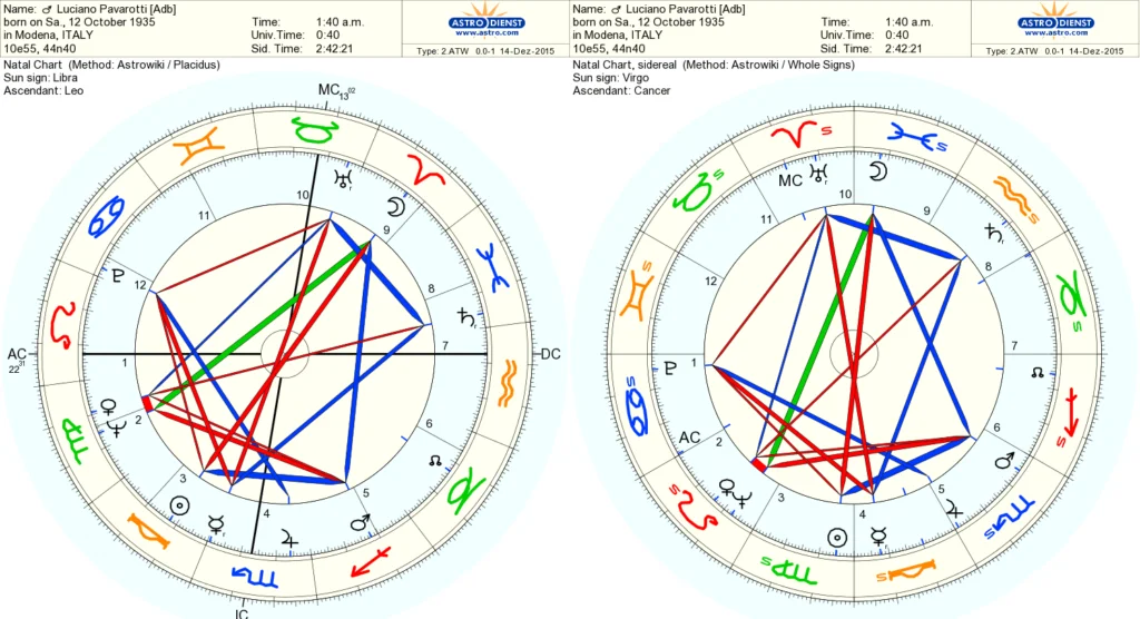 Luciano Pavarotti has a well formed Saraswati Yoga in his chart (Venus in the 2nd, Mercury in the 4th, Jupiter strong by sign in the 5th). His Ascendant lord in the 9th House would no doubt have assisted him in finding his vocation.