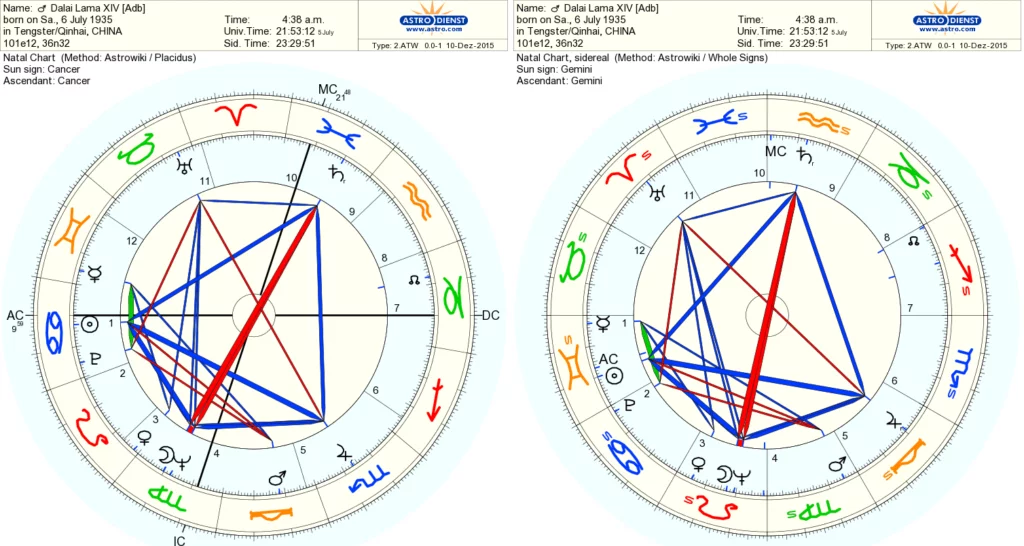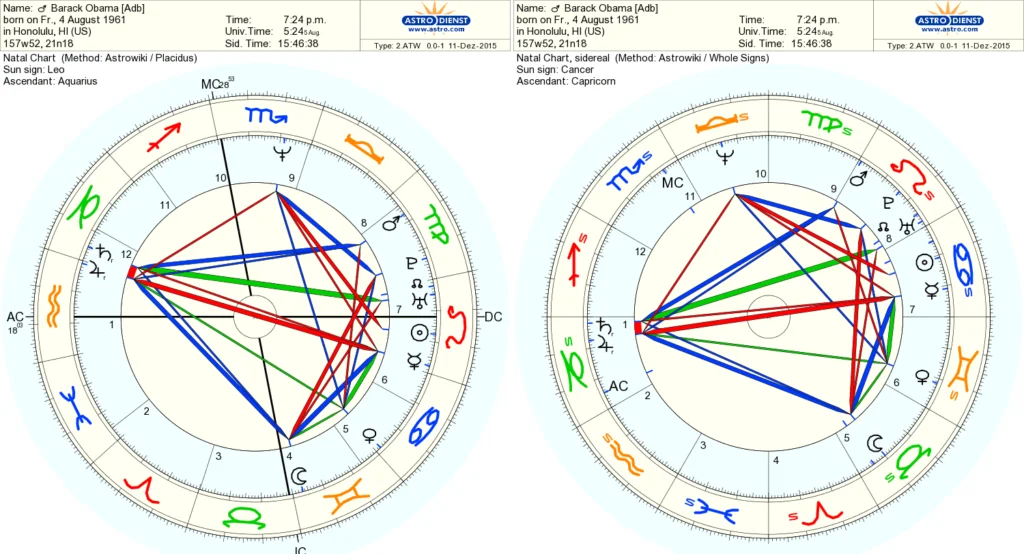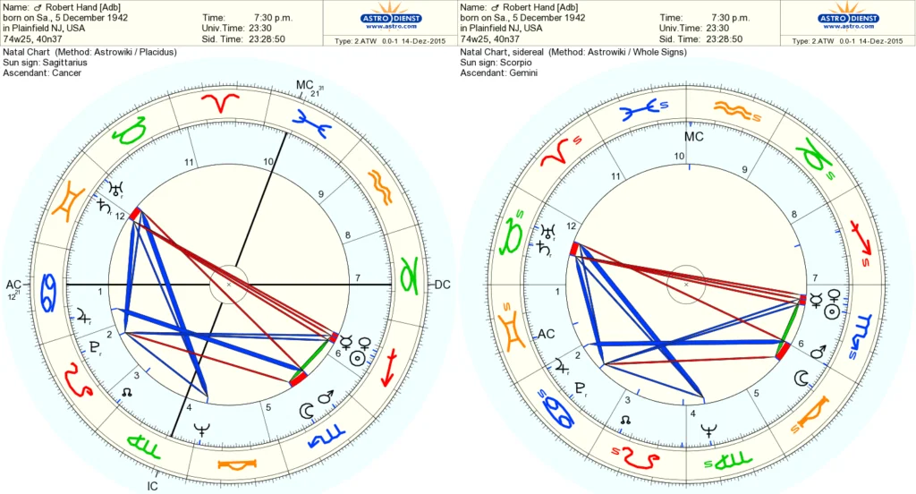 In the case study diagrams that follow, the diagram on the left shows the chart using conventional western Tropical/Placidus settings, and on the right you will find the Sidereal/Whole Sign chart.