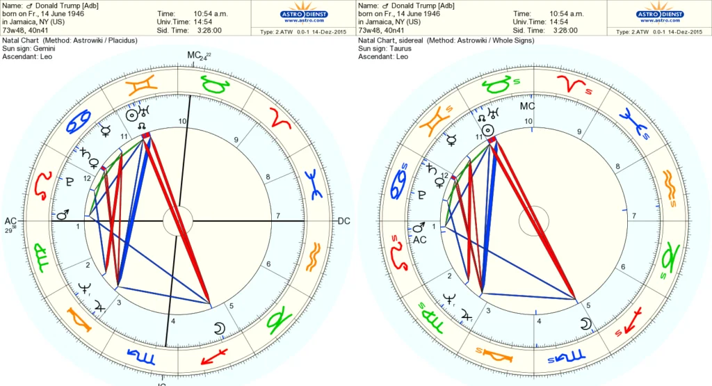 (8) Solar Fire’s database of famous charts, and other sources, give his time of birth as 9:51am. This ambiguity is noted in the source notes of the astro.com astrodatabank entry on Donald Trump.