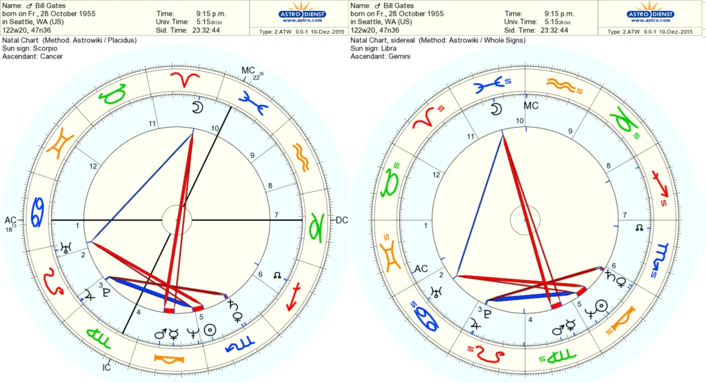 (4) There seems to be some doubt about the correct time of birth for Bill Gates. I have to date been working with the ‘shortly after 9:00pm’ chart as found in Solar Fire’s archive of famous charts. I notice that astro.com gives a chart for 10:00pm but acknowledges the other ‘shortly after 9:00pm’ possibility in the source notes.