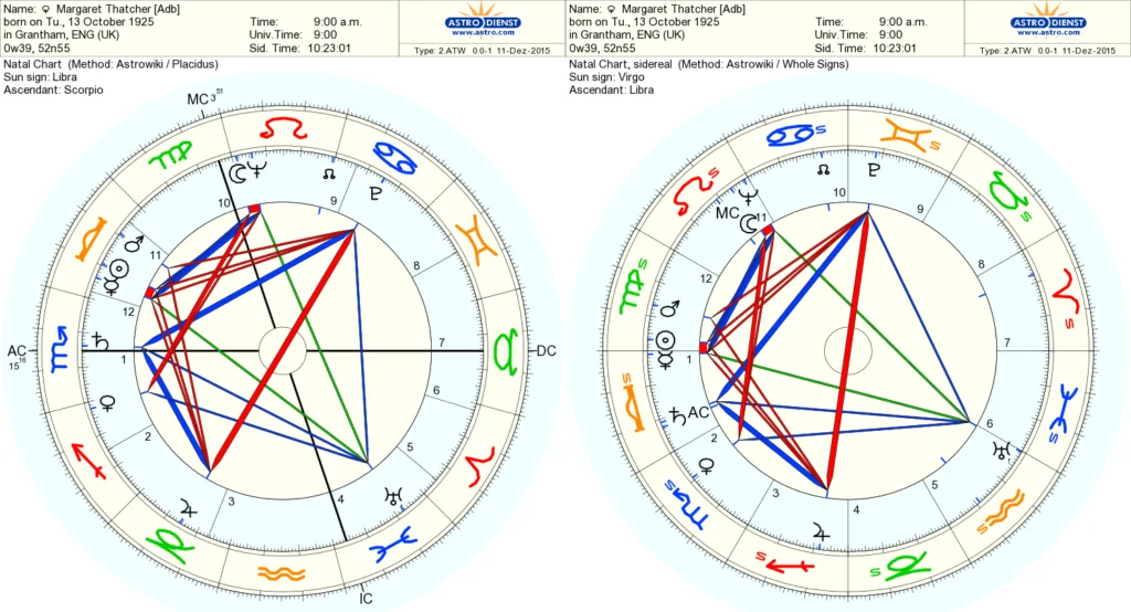 See below Margaret Thatcher’s exalted Saturn in Sidereal Libra in the 1st House; an effective leader perhaps, but much reviled also.