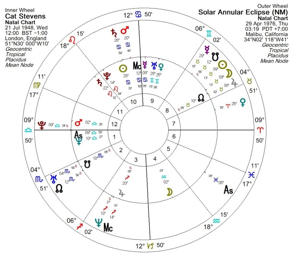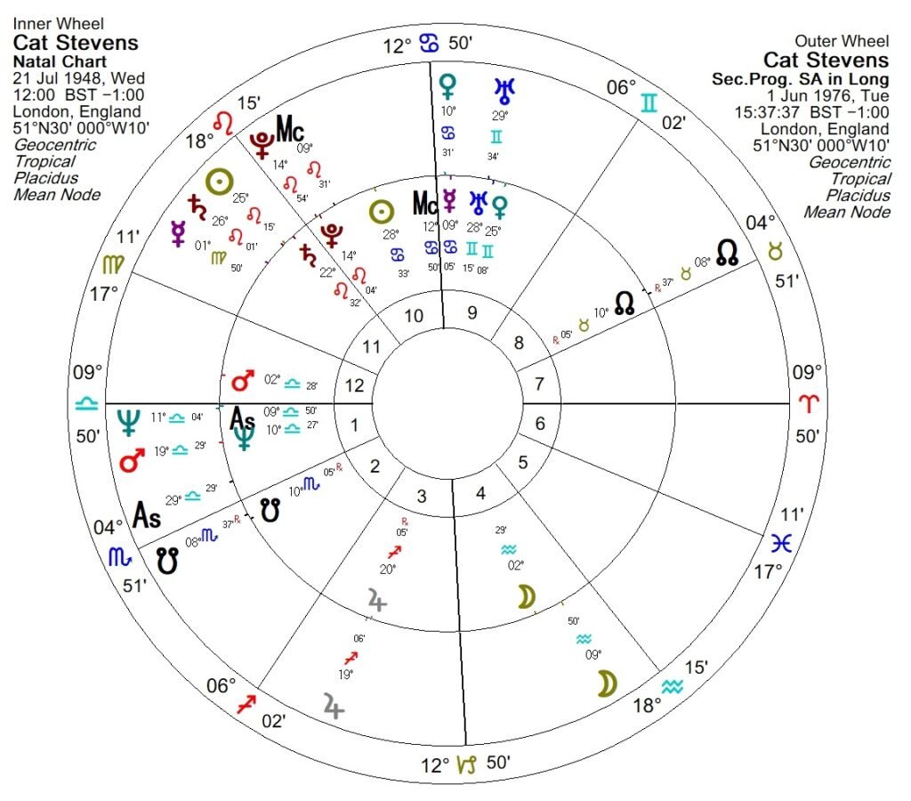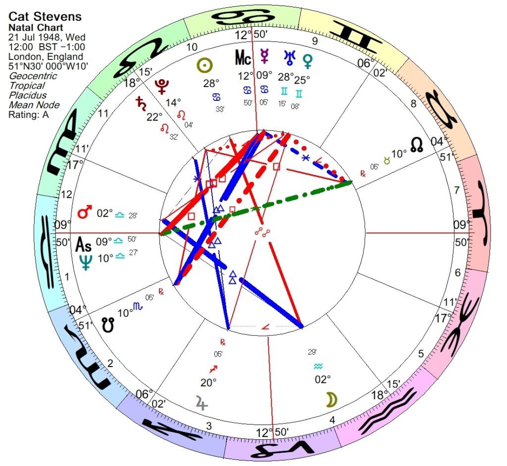 Cat Stevens has always struck me as quite an enigmatic character, but I had never looked at his chart until now. I was fond of his music as a teenager, and I can still appreciate it. In fact, I randomly encountered a performance of“Oh Very Young on YouTube recently which prompted me to search for his chart. I have been aware that he converted to Islam and changed his name some years ago, but beyond that I haven’t ever been curious enough about him to find out more about his life story.