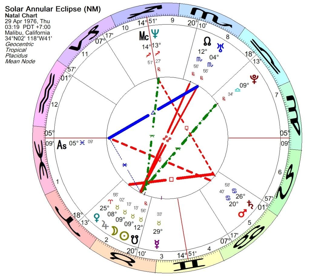 But what about transits? Without knowing the actual date of the event, we can only consider the slowest moving of the planets, but it is a curious fact that during this year of his life the transiting nodal axis is overlaying his natal nodal axis, and that on the 27th of April 1976 there was an annular solar eclipse overlaying his natal node axis. Now, bear in mind that eclipses are said to have an impact, potentially for several months, both before and after they occur. He needn’t have had his near-drowning experience on the date of the eclipse for this eclipse to be relevant to the event.